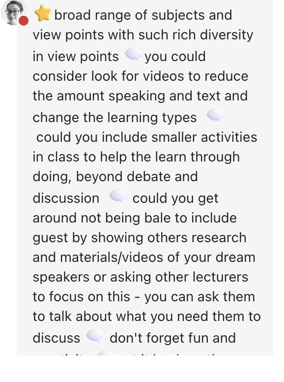 I want students to understand that their identities and experiences are relevant and welcomed, both in the classroom and as subjects of study. I also remain aware that factors of identity may significantly shape how students think about the world and interpret assignments (blog 2). Attempting diverse representation risks stereotyping and tokenism, but I am reassured by peer feedback (fig. 2 and verbal comments). While I can guide lecturers, I cannot control their content.