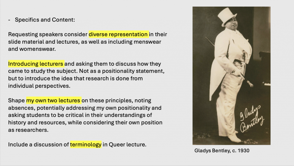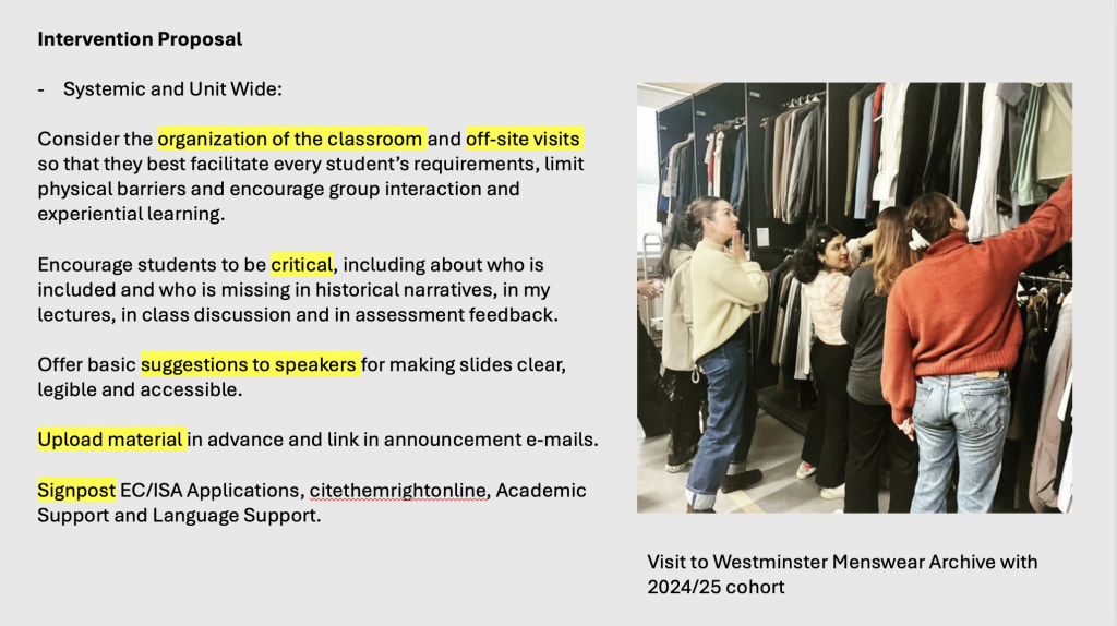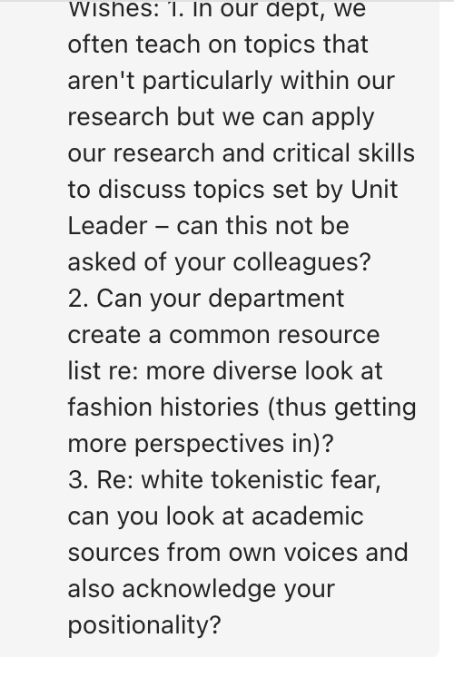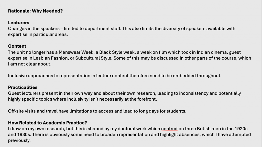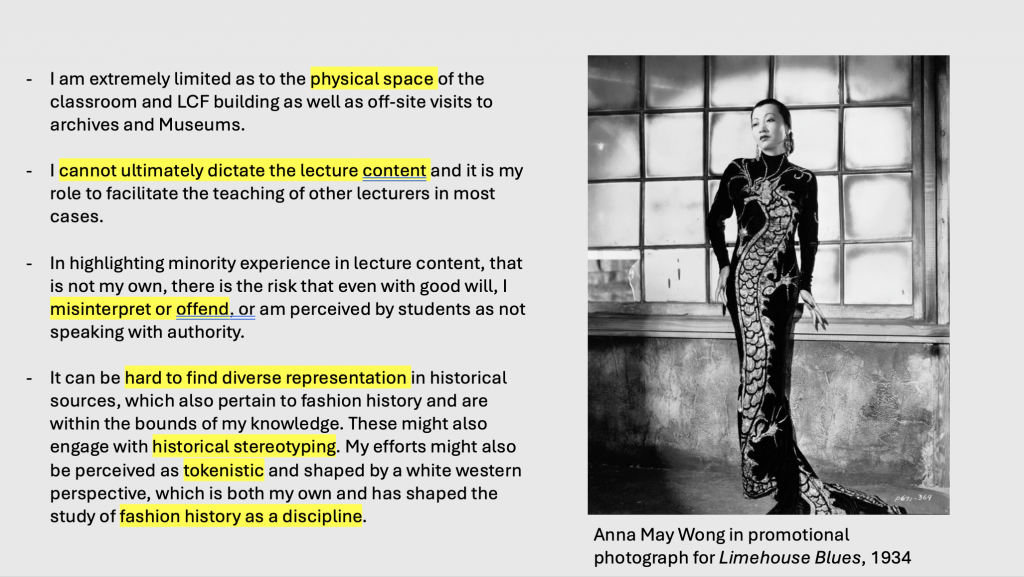 I aim to ask lecturers to consider broadening represented identities in slides and/or discuss why some groups are missing, in order to embed an inclusive approach across the Unit (Maloney, 2020). This is directed by PGcert materials and the ‘protected characteristics’ enshrined in law (Gov.uk), but I acknowledge that what is considered a marginalised group depends on my positionality and that of speakers. This approach more specifically addresses the groups who have frequently been excluded from the white, female, western framing of fashion history.