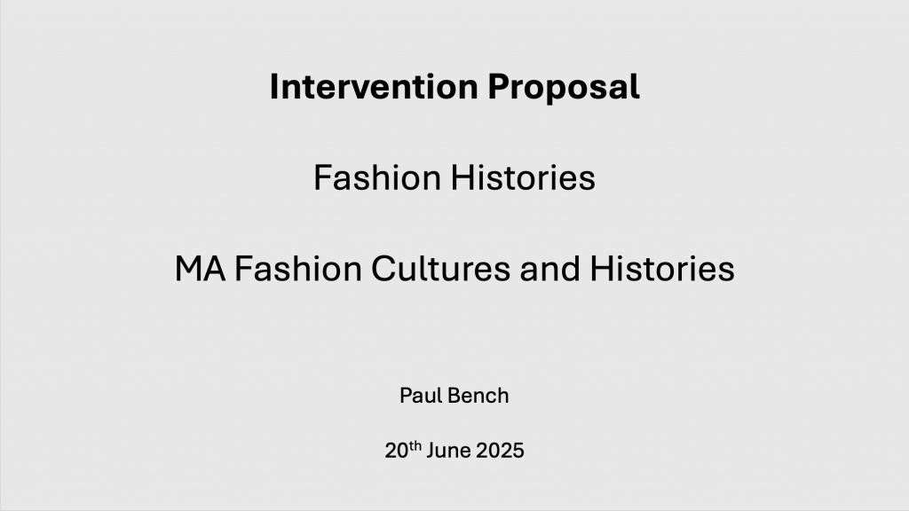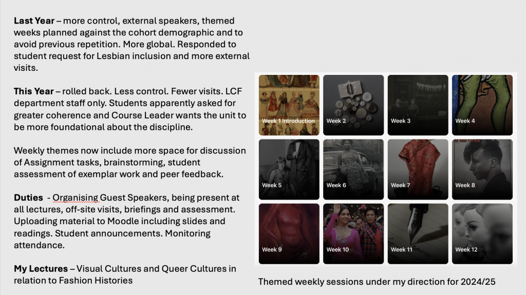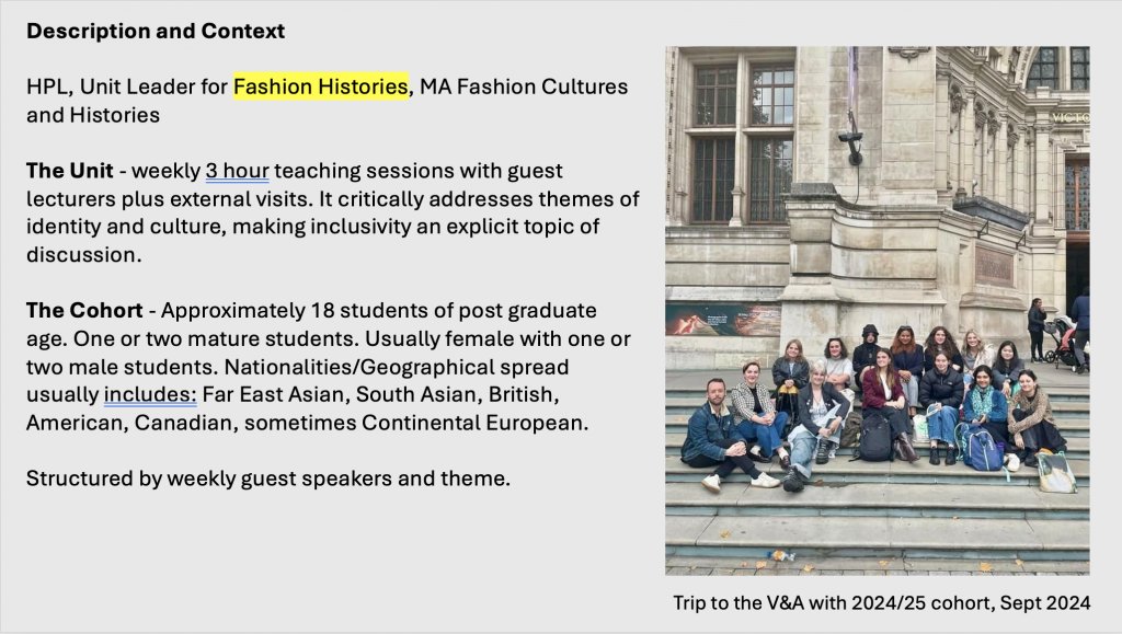 I am Unit Leader and Lecturer for Fashion Histories, on MA Fashion Cultures and Histories at LCF. Although an HPL, I lead this unit, communicating with guest speakers, giving two lectures and taking students on external visits. The Unit promotes critical thinking about historical narratives. I have a co-tutor who assists at intervals. I am present at all lectures, liaising with speakers in advance. Students produce a cultural review and an essay. See proposal and figure 1 for additional context.
