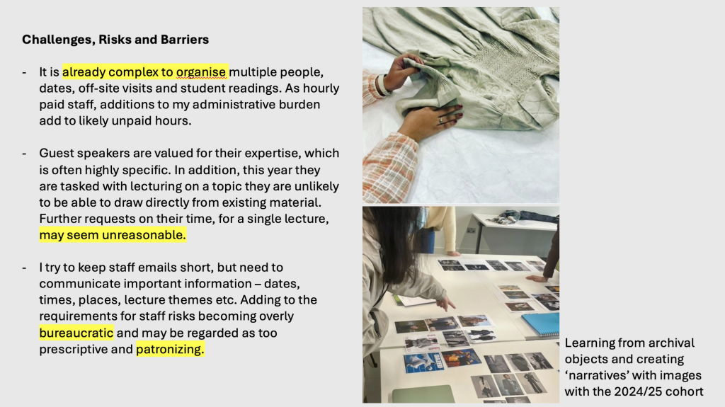 Peer feedback suggested that I include videos and activities to overcome restrictions in speakers (fig. 3). My Course Leader now requests that all speakers include one key reading and 5-6 suggested readings. I am wary of overloading students and the need to encourage their engagement with academic sources. I do see opportunities for developing class activities to promote more active engagement with resources and I will review the course reading list. Prompted by peer comments I discovered Bellet’s (2023) text, which may inform my future approach to teaching fashion history. Comments also made me more conscious of who has written the resources we suggest to students (fig. 2 and verbal comments)