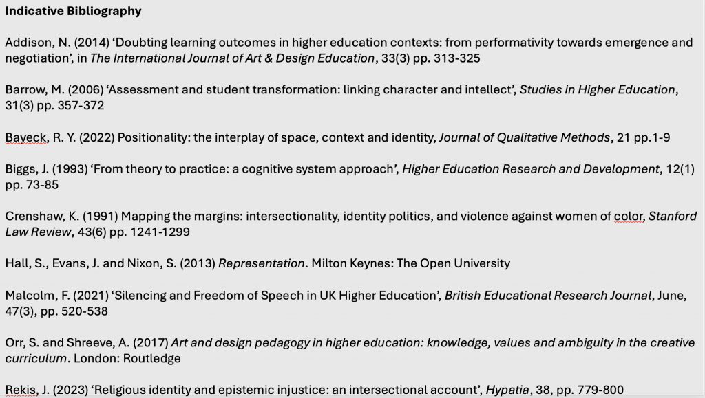 Tutor feedback made me newly situate my actions in light of institutional and national frameworks and policies. I will further investigate and critique policy and my alignment, such as those of Advance HE and UAL’s Access sand Participation Plan. Section 3D of the Plan links to my intervention in aiming at ‘decolonising teaching and learning, belonging and compassionate pedagogy and assessment for social justice’ (p. 17).